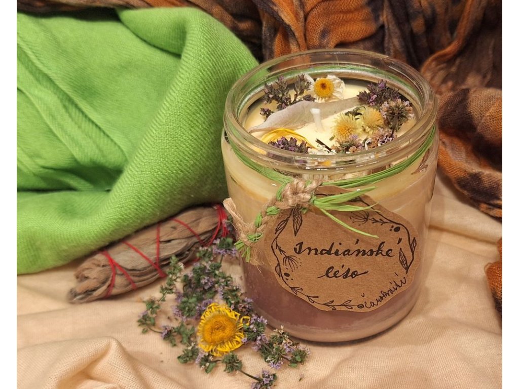 Svíčka s lehce exotickou vůní ovoce, koření a dřevin. Je ozdobena lístky bílé šalvěje a dalšími bylinkami.