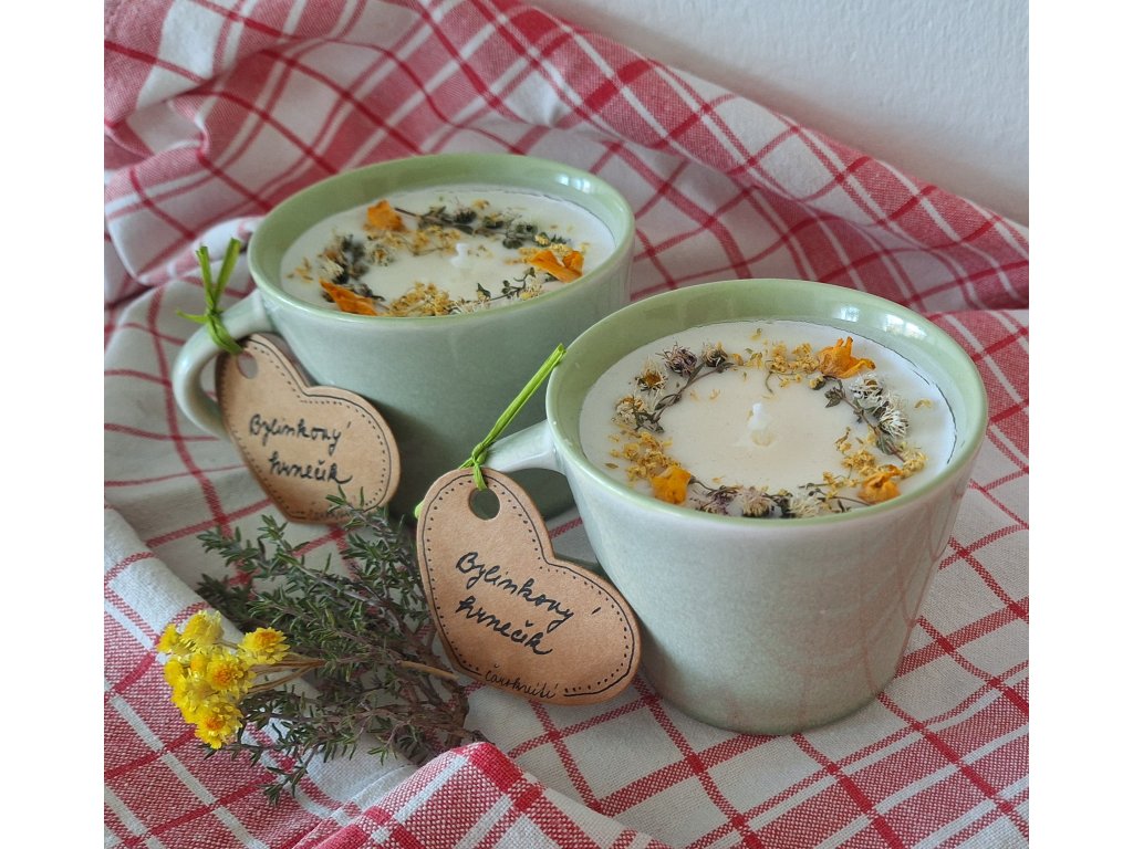 Ozdobou jsou sušené bylinky - krásně žluté květy divizny, květy sedmikrásek, komonice, černého bezu a tymián. Svíčka bude pěknou dekorací i bez zapálení.