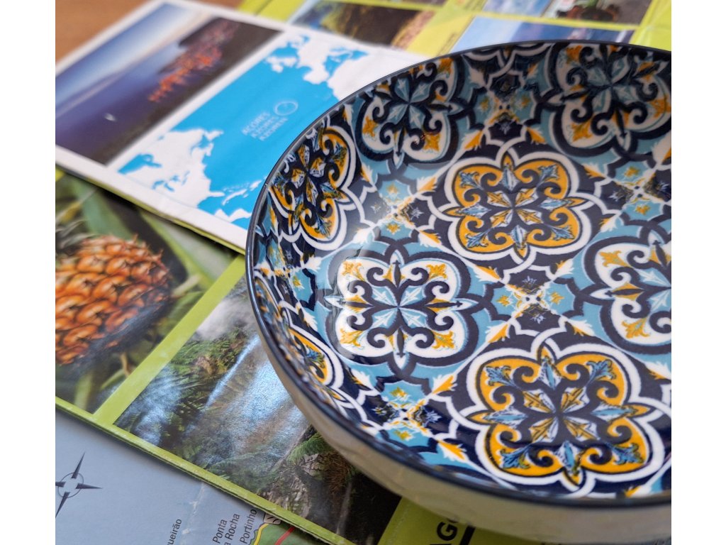 Svíčka se dvěma knoty v keramické misce s typickým motivem - barevnými kachličkami Azulejos, které jsou v Portugalsku všudypřítomné.