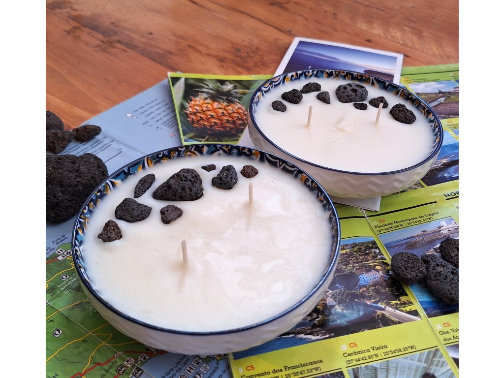 Svíčku jsem dozdobila lávovými kamínky sbíranými na místních plážích. Protože i samotné lávové kamínky jsou porézní a můžou fungovat jako pasivní difuzér, esencemi jsem napustila i tyto kamínky, takže vůně bude výrazná, i když svíčku nezapálíte a necháte si ji jako dekoraci.