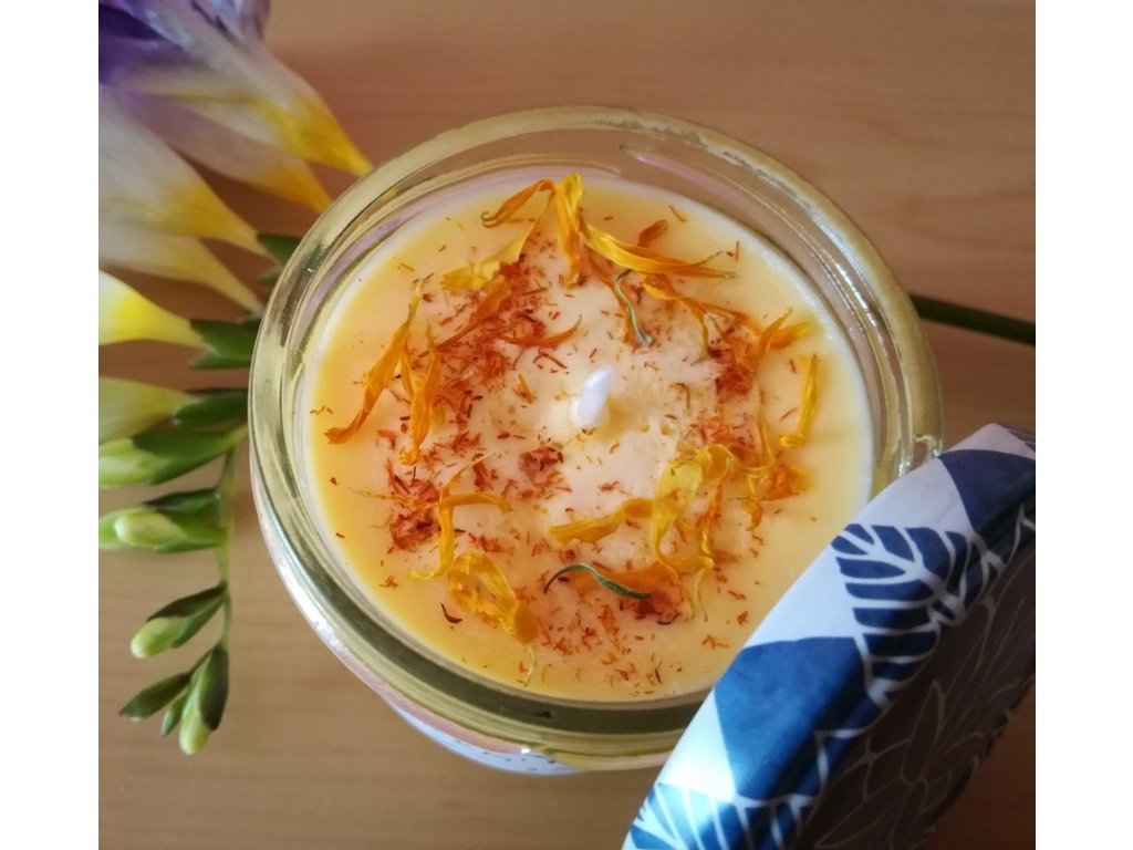 Svíčka vytvořená pro ty, které táhnou exotické dálky...ve vůni jsou nejvýraznější citrusy, neroli a ylang-ylang. Ozdobená je okvětními lístky měsíčku a šafránem, který jsem přivezla z mých milovaných Azorských ostrovů.
