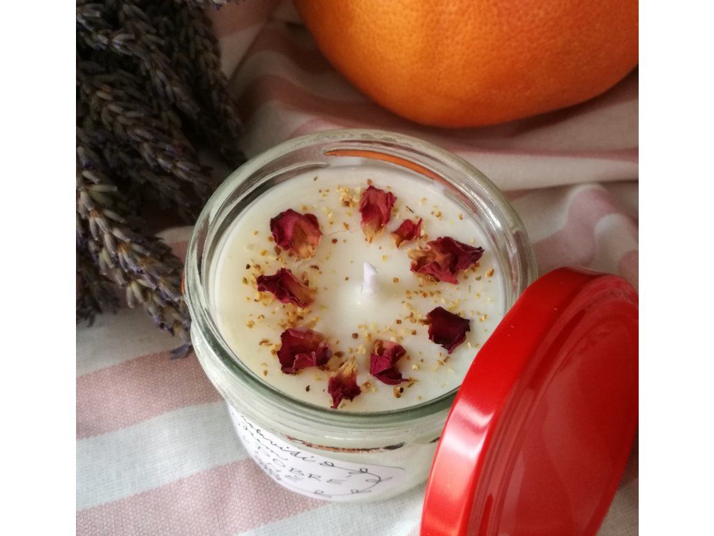 Svíčka je ozdobena kůrou pomeranče a okvětními plátky růže.