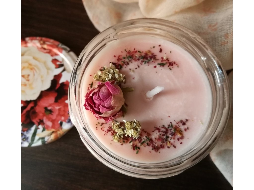 Svíčka pro všechny romantické duše. Je něžná jak barvou, tak jemnou květinovou vůní - geranium a palmarosa. Ozdobena květy růže a dalšími bylinkami.