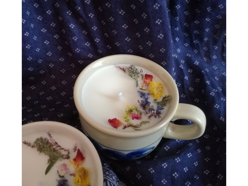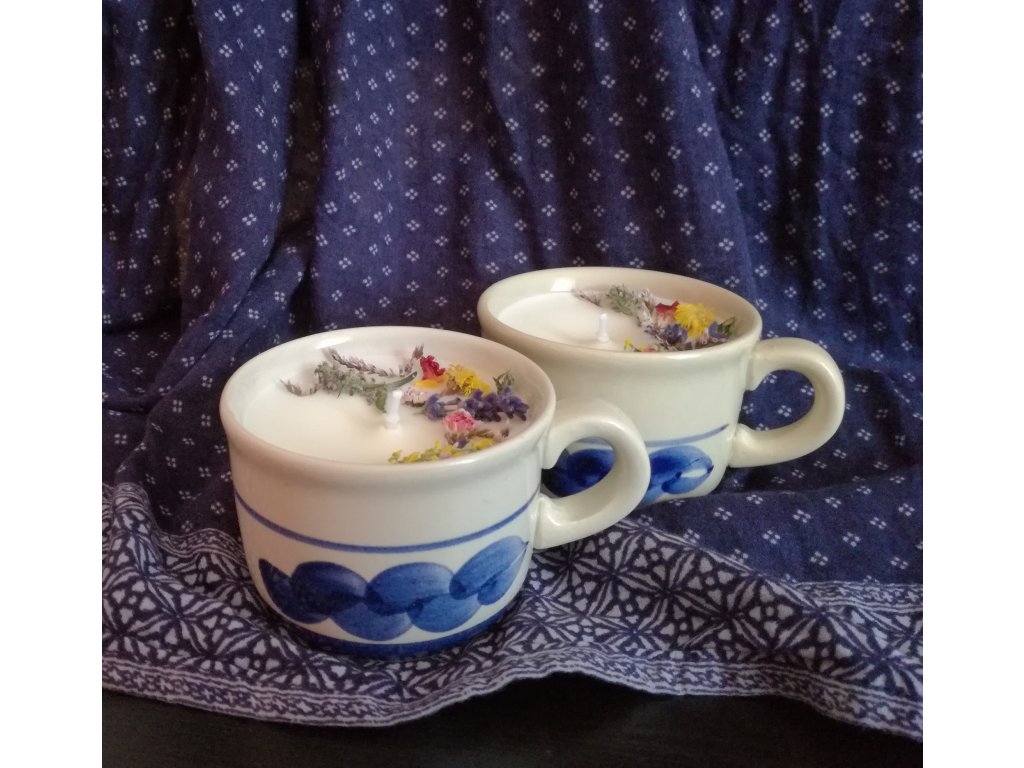 Na trhu mě okouzlily tyto milé (již používané, ale zachovalé) hrnečky a hned jsem v nich viděla krásný obal na svíčky :) A tak vznikla tato hrníčková svíčka zdobená barevnými bylinkami a vonící po citronové trávě a mátě kadeřavé.