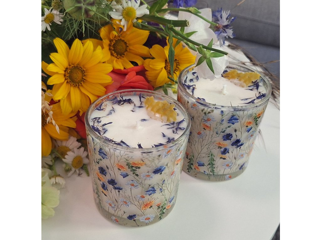 Sójová svíčka v krásné skleničce s motivy lučního kvítí voní po použitých esencích heřmánku, verbeny a medu. Je dozdobena chrpou a kouskem včelího vosku.