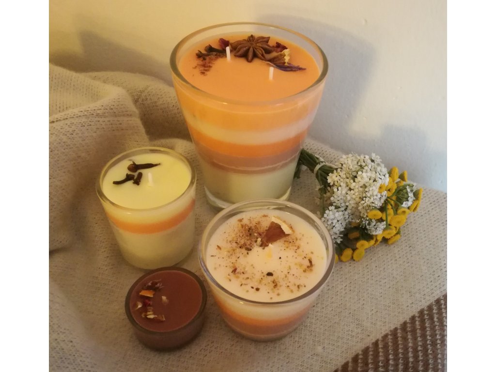 Souprava čtyř svíček v recyklovaných sklenicích různých velikostí obsahuje esence citrusů a koření, které vám příjemně provoní domov :)