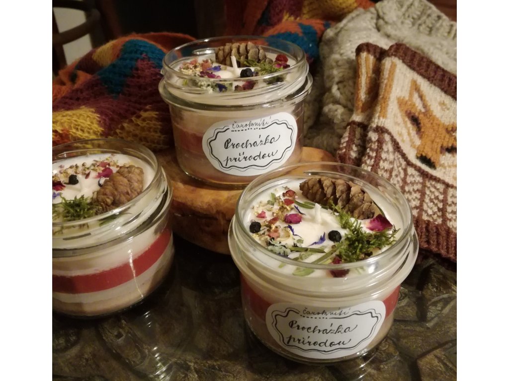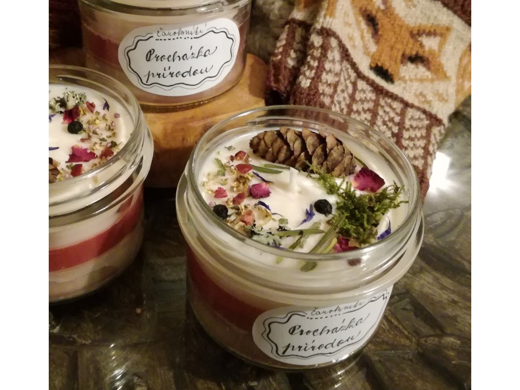 Sójová svíčka je inspirovaná procházkami v přírodě, podle toho jsem také volila esence, které jsou v jednotlivých vrstvách svíčky kombinovány. Mísí se vůně dřevin a bylinek, jako je borovice, růžové dřevo, mech, šalvěj, rozmarýn a divoký tymián...