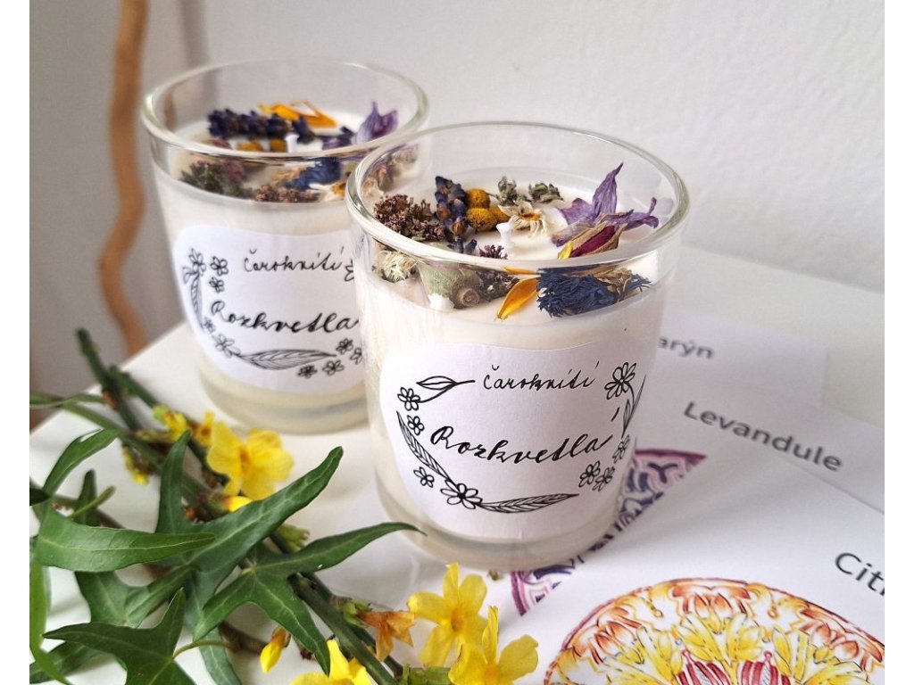 Sójová svíčka zdobená různými květy bylinek Vám přinese kousek louky domů. Má jemnou vůni po citronu, levanduli a rozmarýnu.