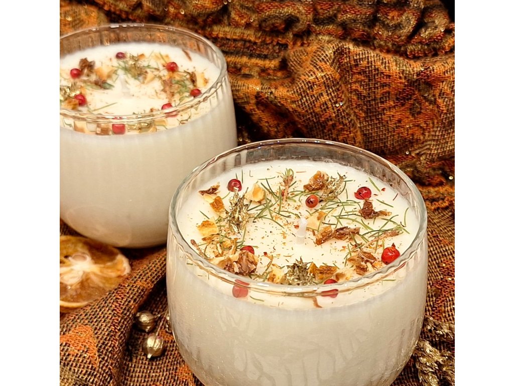 Svíčka v baňaté skleničce, která se bude krásně vyjímat na svátečně prostřeném stole :) Díky lehké vůni citrusů, jedle a jedlových šišek a koření, jako je hřebíček, muškátový oříšek a růžový pepř, vám pomůže vytvořit příjemnou atmosféru.