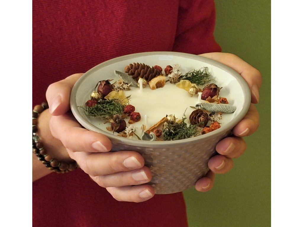 Svíčka se třemi knoty v krásné misce obsahuje esence citrusů, jedle a směsi koření. Je bohatě zdobena bylinkami, sušenými plody, mechem a kousky jantaru.